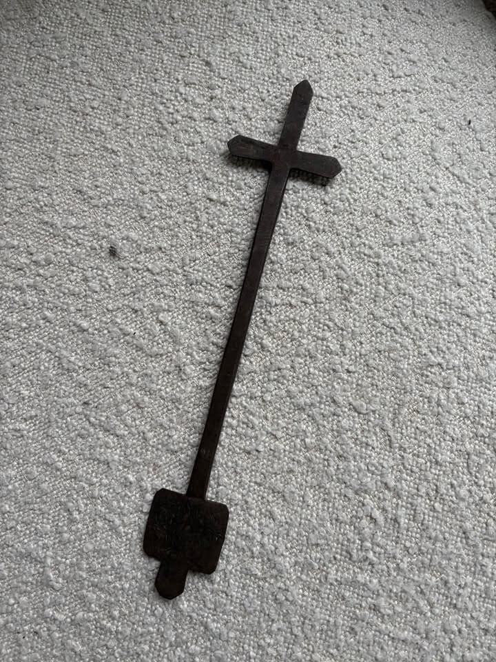 The iron itself tells a story. Hand-forged, with irregular hammering still visible. Dark oxidation layered by time and exposure. Unlike royal crosses cast in brass or silver, iron was the metal of endurance — humble, incorruptible, resistant to vanity. Monks and village clergy often favored it for precisely that reason.